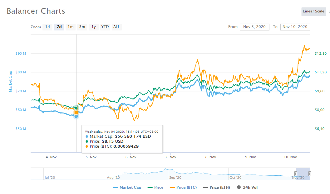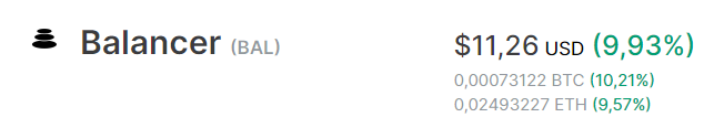 После публикации новостей токен проекта вырос на 15% и протестировал максимум на уровне $11.6. На момент написания материала торговая пара BAL/USDT держится на отметке $11,26, показывая рост на 9% в дневном соотношении.