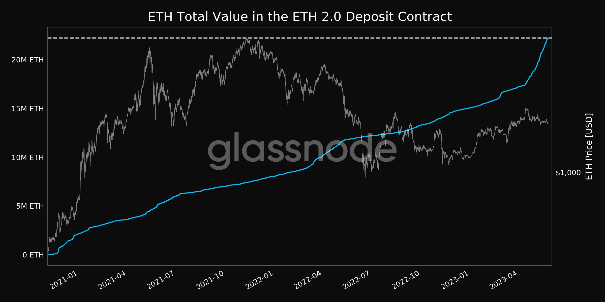 Согласно данным Glassnode, объем депозитов в Ethereum вырос до нового исторического максимума в 22,2 млн монет. Это означает, что в настоящее время количество заблокированных в стейкинге ETH значительно превышает число доступных на централизованных биржах токенов.