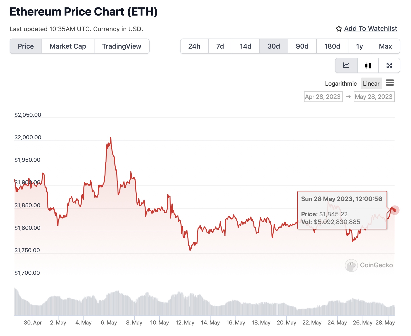 После обновления Shapella цена Ethereum ненадолго превысила отметку в $2 000 долларов, однако затем упала до текущих уровней. За последние 24 часа ETH прибавил 0,9% и торгуется на отметке $1 845.