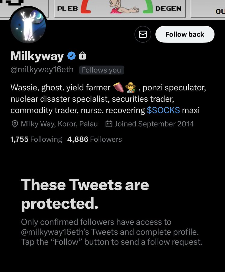 Пользователь под таким ником относит себя к числу трейдеров и фермеров доходности. Однако сейчас его аккаунт в «Твиттере» переведен в разряд закрытых.