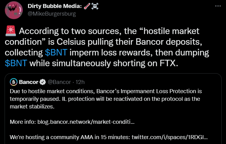 Как сообщил пользователь под ником @MikeBurgersburg со ссылкой на собственные источники, под «враждебными рыночными условиями» подразумевается Celsius Network, который выводит токены BNT с Bancor, а потом активно продает на бирже FTX.
