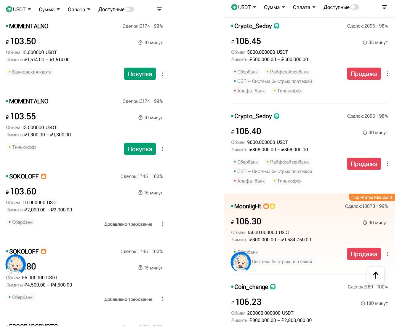 На P2P-платформах курс рубля по отношению к долларовым стейблкоинам согласуется с общей динамикой российской валюты. На момент публикации обменять USDT на рубли можно по курсу от 103,5 рублей за 1 стейблкоин.