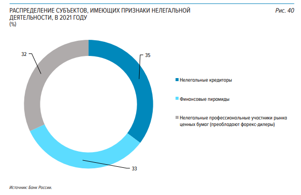 По итогам 2021 года выявлено 2679 субъектов с признаками нелегальной деятельности на финансовом рынке, в том числе с признаками финансовых пирамид. Об этом у себя в годовом отчете сообщил Банк России. При этом свыше половины выявленных финансовых пирамид (460 случаев) привлекали средства через криптовалюту, отмечает мегарегулятор.