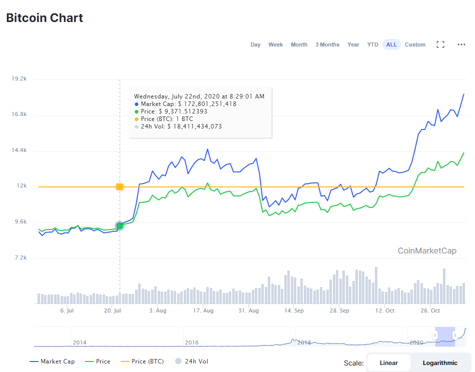 Как утверждает Роджерс, банк приобрел биткоины по рыночному курсу в $9 300. Это значит, что при текущем курсе окупаемость инвестиций составила 400%. Несмотря на то, что точной даты покупки он не называет, в последний раз биткоин торговался на таких значениях в июле 2020 года.