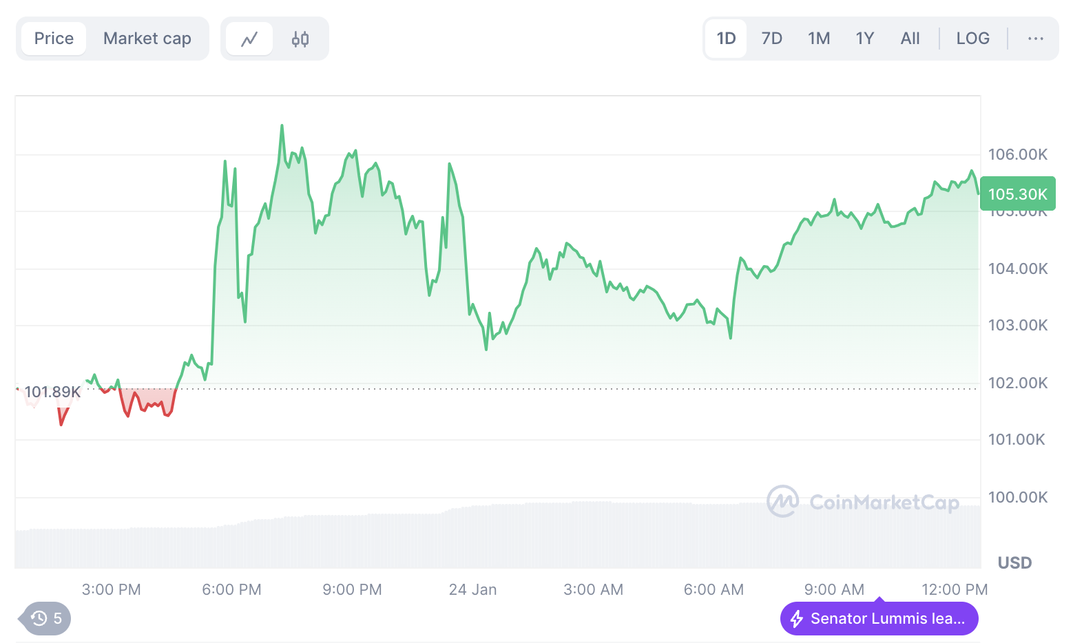 После объявления Банка Японии цена биткоина в моменте просела на 3%, но к моменту написания этого материала уже восстановилась. Сейчас BTC торгуется по $105 303, согласно CoinMarketCap.