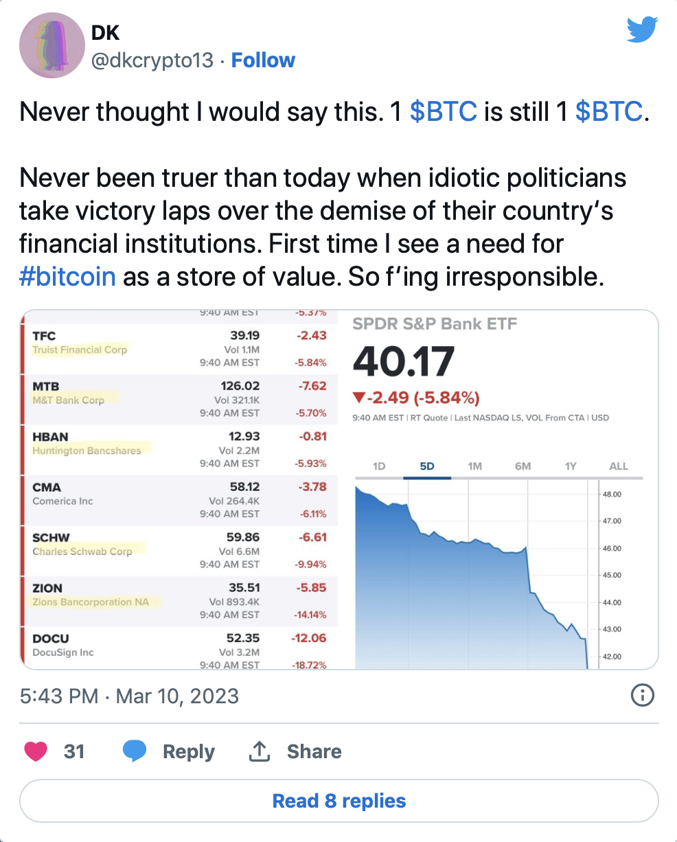 Некоторые представители отрасли считают, что действия американских властей в отношении банков направлены против криптовалют. Так, один из членов правления банка Signature заявил, что произошедшее с компанией представляло из себя ни что иное, как послание от регулятора представителям Web3-индустрии. Однако главный политический директор Blockchain Association Джейк Червински считает, что криптовалюты не виноваты в проблемах банков. В любом случае, правительство обязательно попытается установить контроль над рынком.