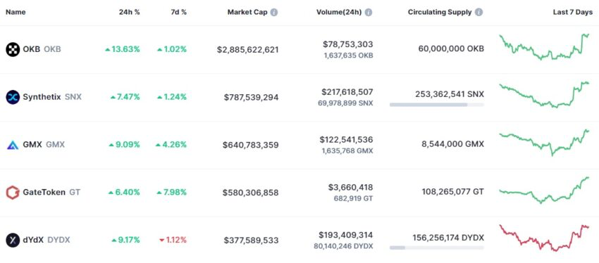 Финансовые потрясения, вызванные закрытием нескольких банков, положительно сказались на токенах централизованных (CEX) и децентрализованных (DEX) бирж. Некоторые из них резко прибавили в цене за последние 24 часа. Среди лидеров роста оказались OKB, GMX, dYdX и GT – они подорожали на 13%, 10%, 8% и 7% соответственно.