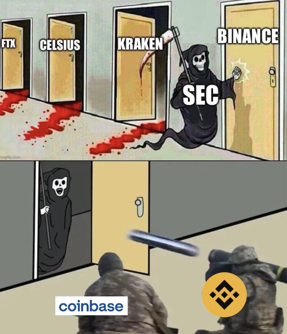 Еще одной горячей темой для обсуждений на этой неделе стало будущее крупнейшей криптовалютной биржи Binance. Напомним, в начале месяца Комиссия по ценным бумагам и биржам США (SEC) предъявила торговой платформе 13 обвинений. У регулятора, в том числе, возникли вопросы к американскому подразделению биржи. Под ударом также оказалась еще одна из крупнейших криптобирж — Coinbase. Многие криптаны считают, что торговые платформы, объединив усилия, смогут противостоять SEC.