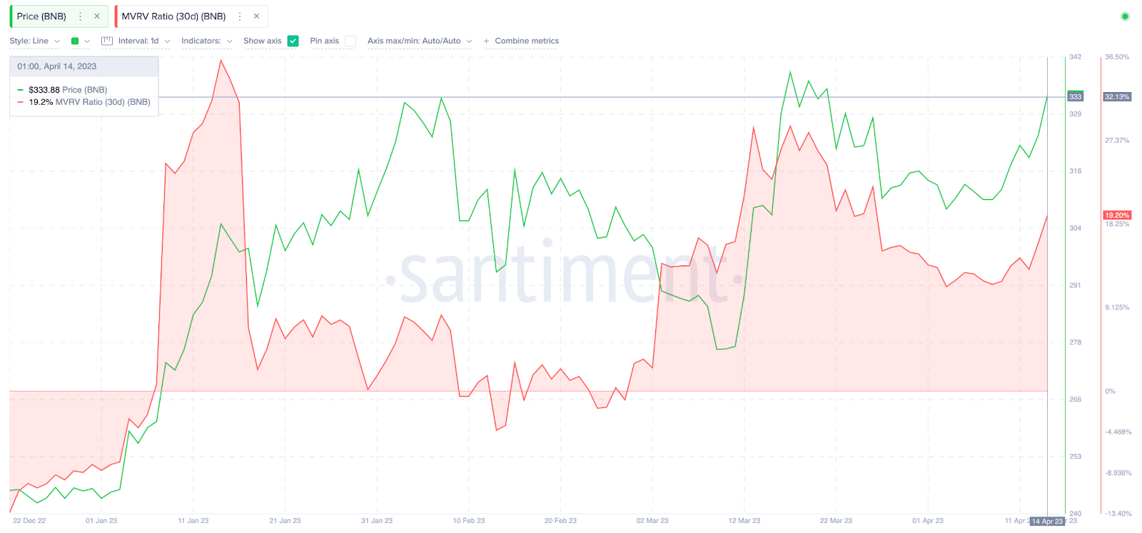 Показания индикатора MVRV свидетельствуют о том, что цена BNB может вырасти до $360, прежде чем инвесторы начнут фиксировать прибыль. Данная метрика оценивает соотношение рыночной стоимости к реализованной и определяет потенциальные зоны покупки/продажи, оценивая среднюю цену, по которой текущие держатели приобрели актив.