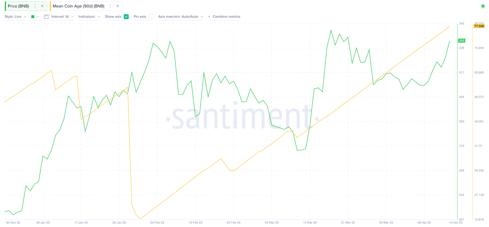 Долгосрочных инвесторов, похоже, совсем не пугает FUD вокруг Binance. На графике ниже показано, что средний возраст монет в сети BNB находится в восходящем тренде: в период с 9 марта по 14 апреля он увеличился с 44,30 до 77,53.