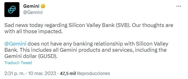 SponsoredСпустя час Gemini тоже опубликовала твит, в котором выразила сожаление о случившемся с Silicon Valley Bank и объяснила, что криптобиржа не взаимодействует с проблемным банком, не пользуется его услугами и не хранит в нем обеспечение для своего стейблкоина Gemini Dollar (GUSD).