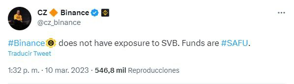 Глава Binance написал в «Твиттере», что криптобиржа не имеет никаких связей с Silicon Valley Bank и заверил, что все ее средства находятся в безопасности. Твит с аналогичным содержанием появился и в официальном аккаутнет компании.
