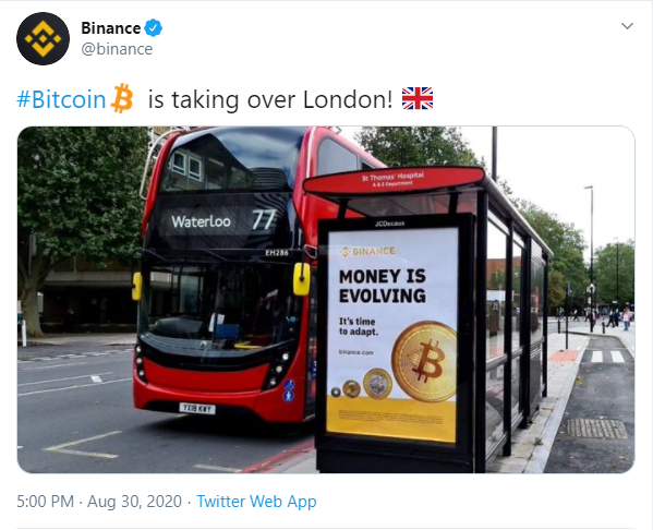 Реклама главной криптовалюты биткоина появилась сразу на нескольких остановках городского транспорта в Лондоне. Информация об этом появилась в официальном аккаунте Binance в Twitter. Представители криптовалютной биржи разместили фотографию с припиской “Bitcoin захватывает Лондон”.
