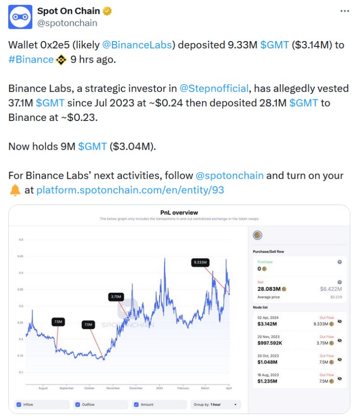 По данным Spot On Chain, 2 апреля адрес 0x2e5, принадлежащий Binance Labs, вывел 9,33 млн GMT на общую сумму в $3,14 млн.