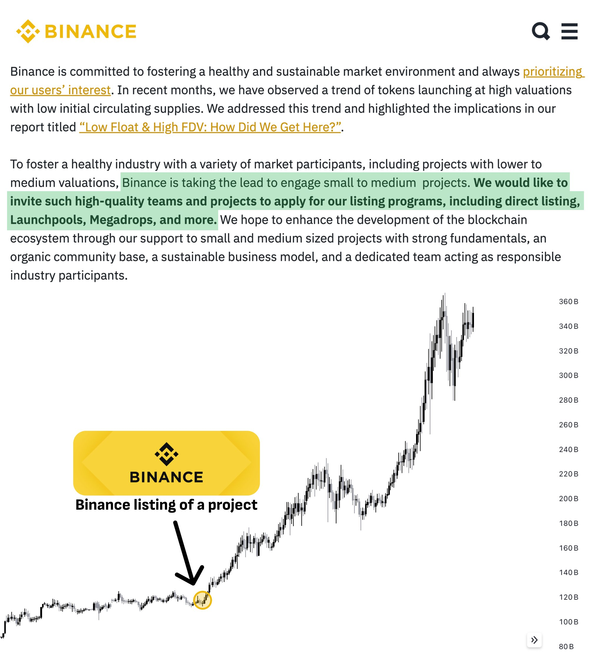 Команда крупнейшей криптобиржи Binance объявила о планах сделать акцент на листинг криптовалют с небольшой и средней капитализацией. Часто запуск торгов монетой на платформе провоцирует активный рост ее курса.