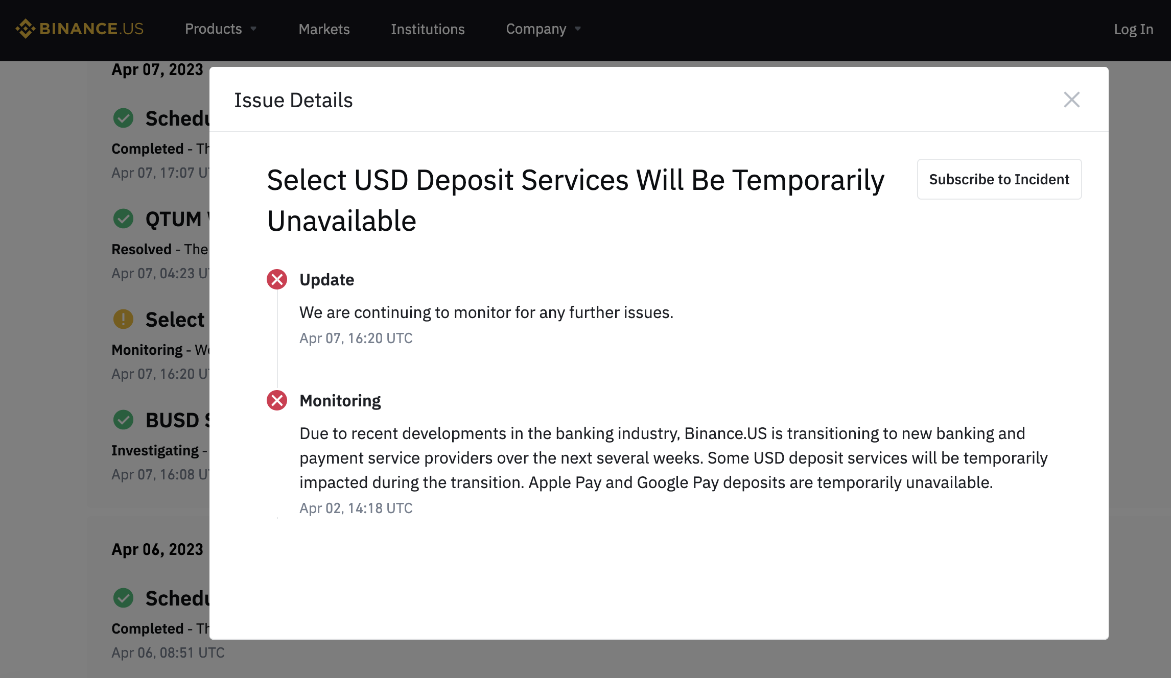В недавнем обновлении статуса Binance сообщила, что «переходит на новых поставщиков банковских и платежных услуг в течение следующих нескольких недель», добавив, что некоторые услуги по депозитам в долларах США будут временно затронуты во время перехода.