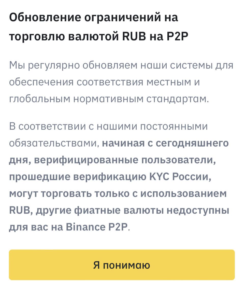 - Если вы прошли RU KYC на Binance и живете в России, теперь на P2P из фиатных валют вам доступен ТОЛЬКО рубль (RUB).