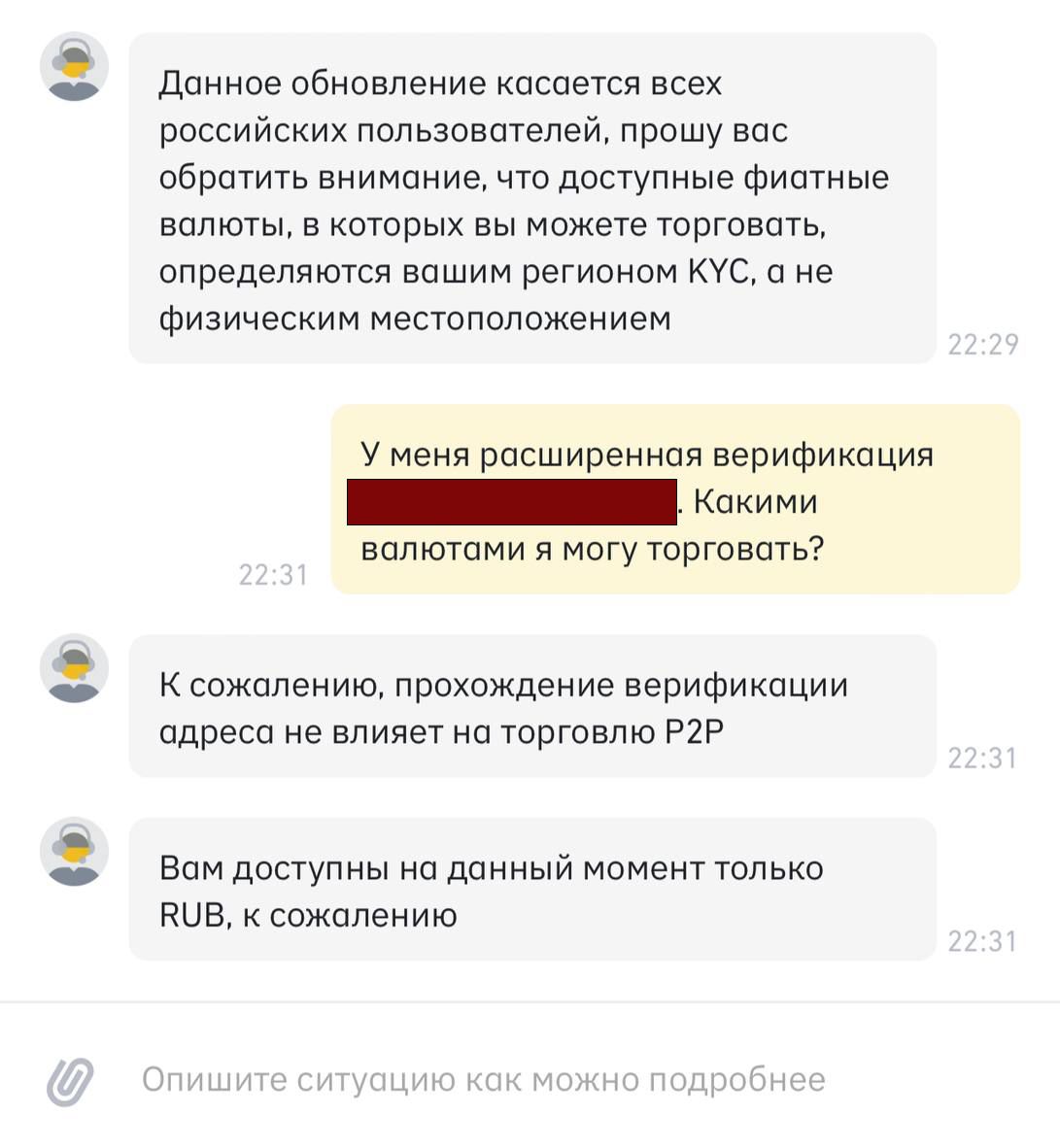 После общения с технической поддержкой биржи журналисты BeInCrypto выяснили, что ограничения касаются всех аккаунтов, в том числе прошедших расширенную верификацию по адресу за пределами РФ.