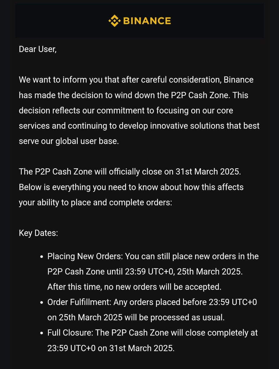 Binance, крупнейшая криптовалютная биржа по объему торгов, объявила о закрытии функции P2P Cash Zone. Согласно официальному уведомлению, сервис, позволяющий пользователям покупать и продавать криптовалюту за наличные через зарегистрированных мерчантов, прекратит свою работу 31 марта 2025 года
