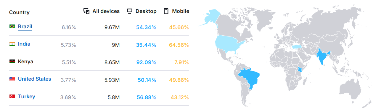 Сервис semrush дает немного другие результаты. По данным платформы, на первом месте по объему трафика Binance находится Бразилия. Индия, если верить статистике сервиса, лишь на втором месте. При этом в топ-5 источников трафика Binance по версии semrush, в отличие от similarweb, также входят Кения и США. Напомним, у Binance есть американское подразделение Binance.US, к которому у местных регуляторов много вопросов.