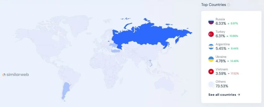 До выхода из РФ россияне были главной аудиторией Binance. На пользователей из России приходилось 6,33% трафика. На втором месте с результатом 6,31% шли турки.