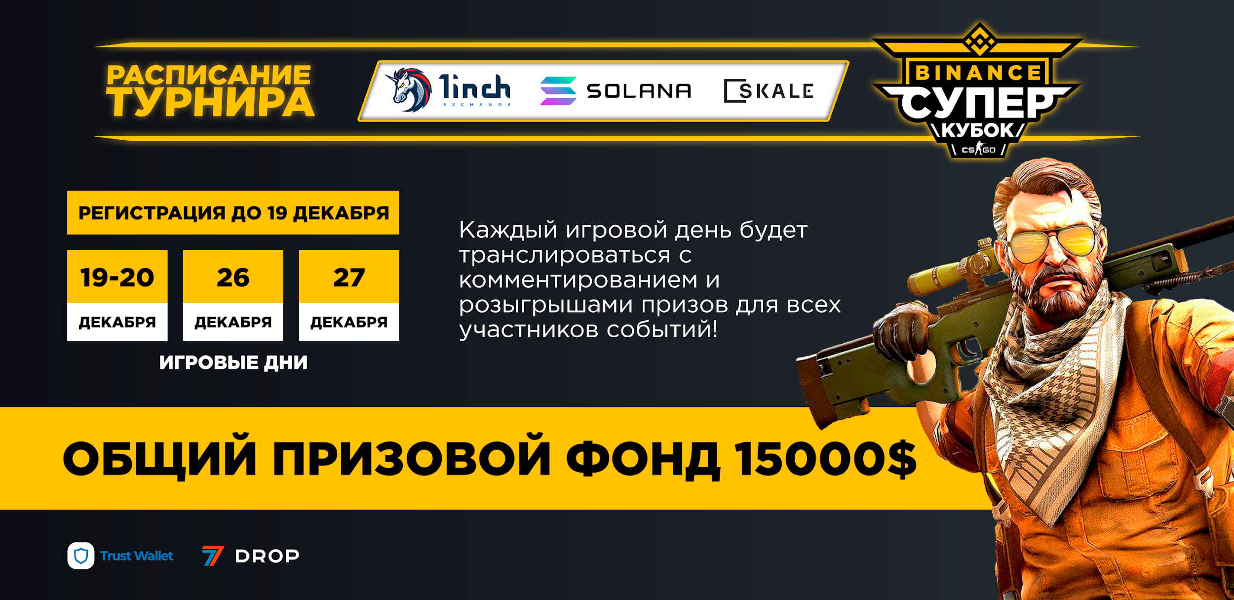 Криптовалютная биржа Binance при поддержке Solana, 1inch, SKALE Network, Trust Wallet, 77Drop и HyperPC объявила о проведении киберспортивного турнира “Binance СУПЕР КУБОК” по дисциплине CS:GO с общим призовым фондом более миллиона рублей.