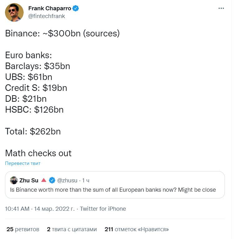 Популярная криптобиржа Binance обошла по капитализации европейские банки. Такими подсчетами в своем микроблоге поделился соучредитель компании 3ac Чжу Су
