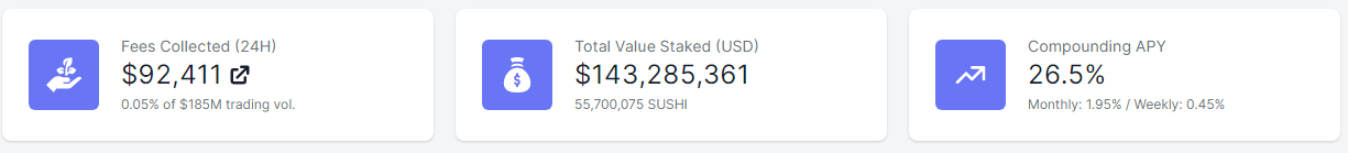 На момент написания материала доходность от стейкинга SUSHI на Sushiswap составляет 26,5% годовых (что на 2,01% больше, чем предлагает биржа).