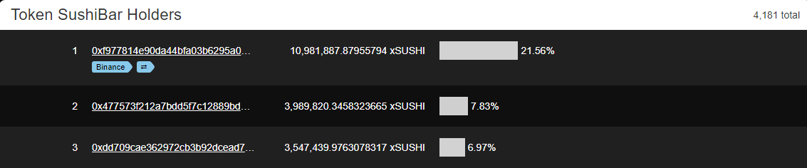 Переведя 12 млн токенов SUSHI, Binance, согласно данным ресурса ethplorer.io, стала крупнейшим стейкером в контракте, имея 21.56% от общего объема заложенных активов.