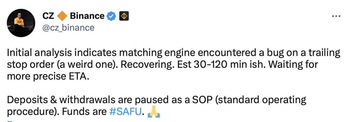 Позднее глава крупнейшей криптобиржи Чанпэн Чжао пояснил, что в движке, который занимается сопоставлением торговых ордеров, выявили странную неполадку, связанную со скользящим стопом. По его оценкам на устранение проблемы уйдет около получаса.