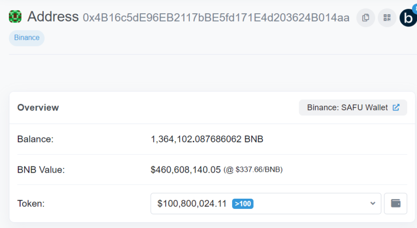 На кошельке фонда в BNB и USDT находится примерно 1 364 102 BNB или $458 257 191.