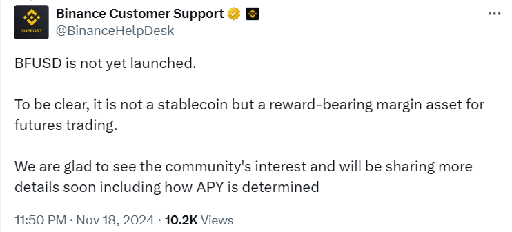 Из-за поднявшейся шумихи команде Binance пришлось уточнить информацию об инициативе. По их словам, BFUSD не является стейблкоином. Монета представляет собой доходный маржинальный актив для трейдинга фьючерсами. Также представители Binance пообещали со временем предоставить больше информации о BFUSD и инструментах расчета его доходности.