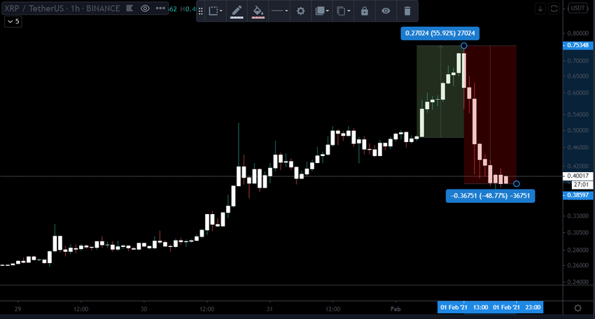 Между тем, XRP пережил один из самых волатильных дней. Токен за несколько часов вырос на 56%, с $0,48 до $0,75 и на короткое время вернулся в тройку лидеров по капитализации. Однако радость быков оказалась недолгой. Оттолкнувшись от максимума, монета резко пошла вниз и также в считаные часы рухнула с $0,75 до $0,39.