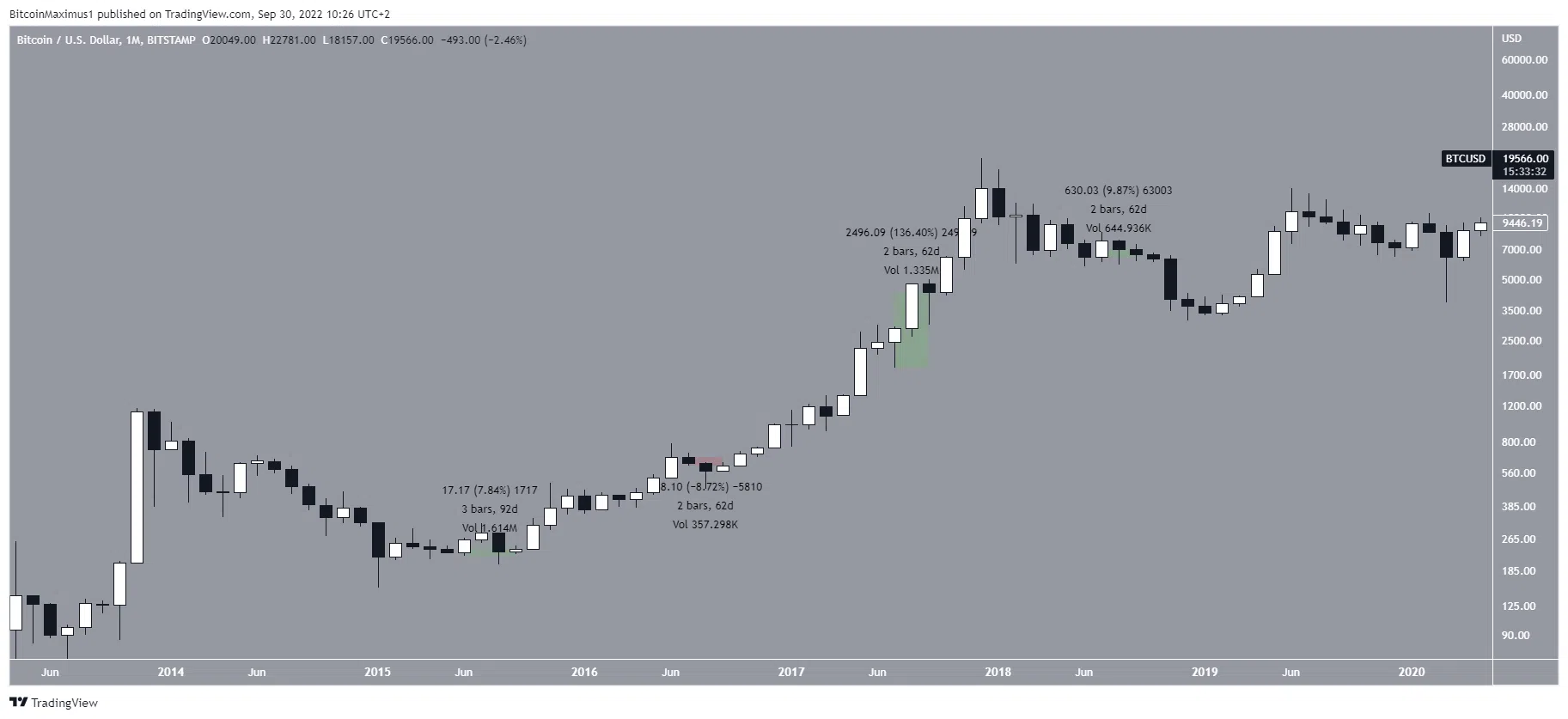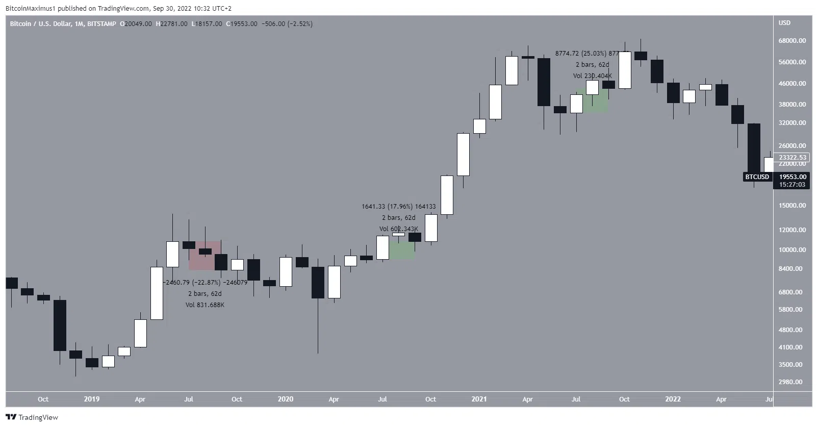 Не нарушая традицию, BTC показывал смешанную динамику в 3 квартале в 2019, 2020 и 2021 годах. Цена упала на 23% в 2019 году, выросла на 18% в 2020 году и на 25% в 2021 году.