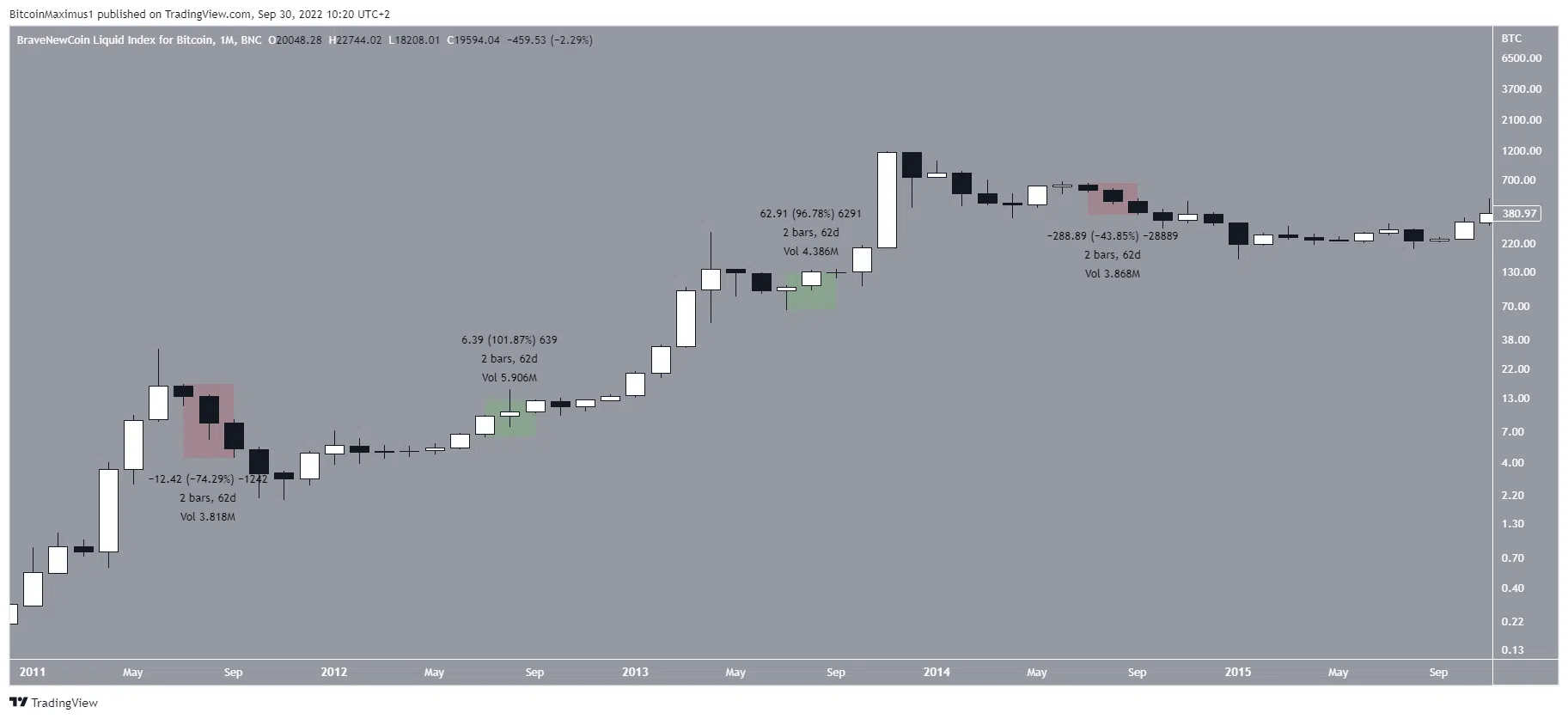 С 2011 по 2014 годы биткоин не демонстрировал никаких паттернов поведения в третьем квратале.