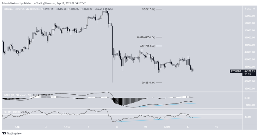 Эти сигналы совпадают с картиной на дневном таймфрейме, который указывает на разворот тренда. Между тем на двухчасовом графике BTC готовится к отскоку.