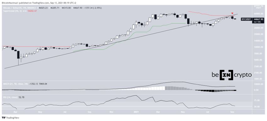 Снижение произошло после отскока от восходящей линии поддержки, которая ранее сформировалась от линии сопротивления супертренда. Таким образом BTC подтвердил ее в качестве сопротивления.