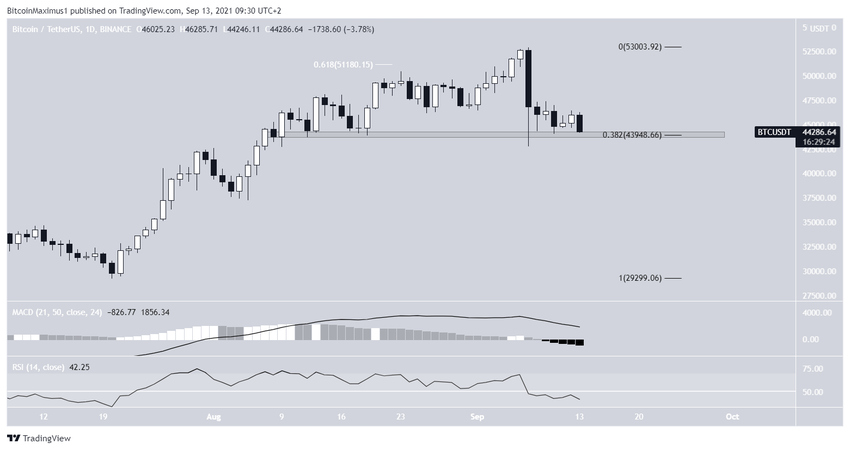 На дневном графике видно, что BTC торгуется выше важной поддержки $43 950. Она сформирована горизонтальной областью поддержки и 0,382 коррекции Фибоначчи.