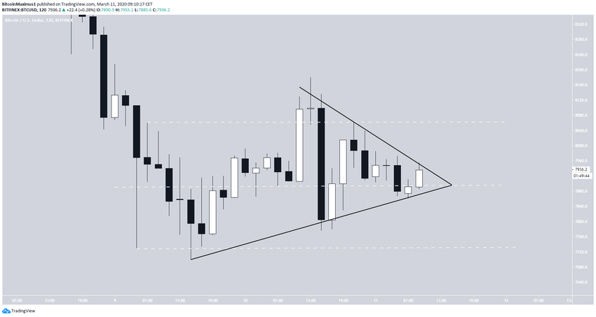 - Вероятно, биткоин торгуется внутри краткосрочной модели «симметричный треугольник».