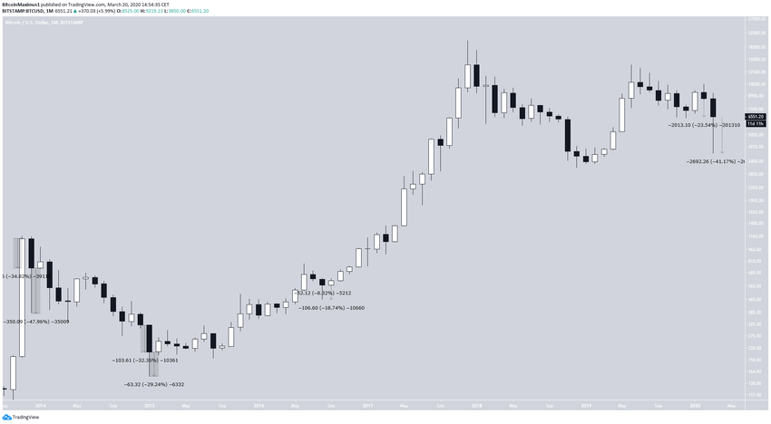 За минувшую неделю курс биткоина (ВТС) сумел восстановиться от минимальных значений. Это побудило нас пересмотреть наше предыдущее сравнение масштабов падения цены в этом марте с другими медвежьими для ВТС месяцами. Для этого мы рассмотрим месячный свечной график по биткоину.