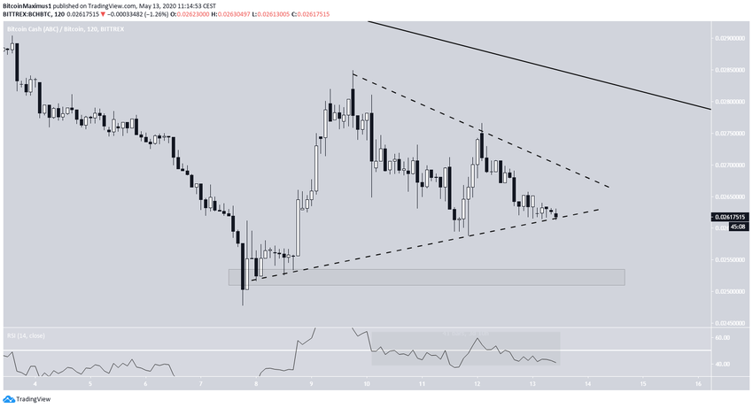 Курс BCH торгуется внутри очень сильного уровня поддержки в районе ₿0.026. Цена не опускалась ниже него с июля 2019 года, поэтому в случае пробоя этого уровня пару может накрыть агрессивное и стремительное снижение.