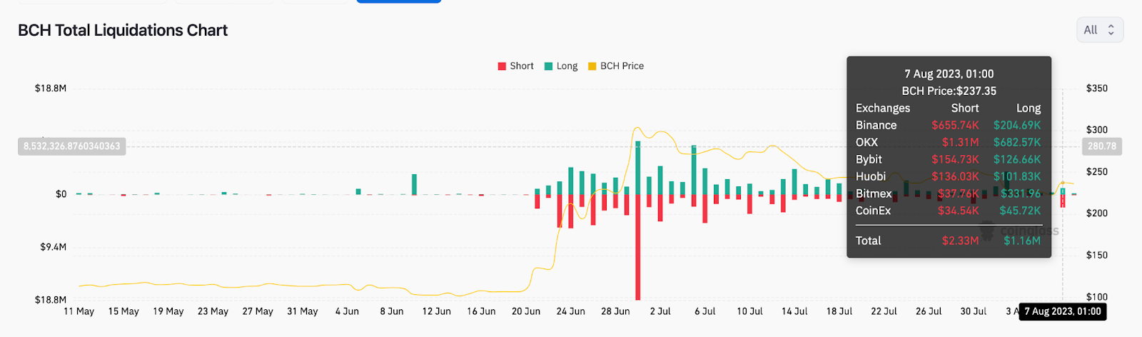 Трейдеры, которые открыли короткие позиции по Bitcoin Cash, несут большие потери. По данным аналитического портала Coinglass, стоимость ликвидированных 7 августа «шортов» составила $2,33 млн. Это самый высокий объем принудительно закрытых позиций с 13 июля.