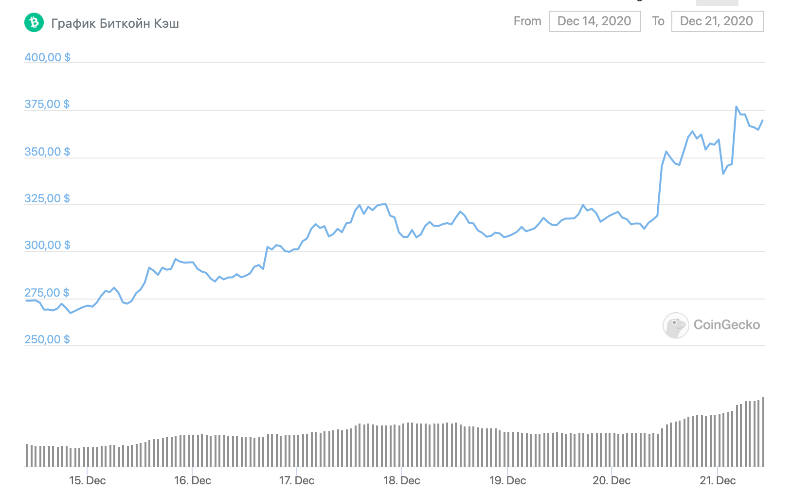 На момент написания статьи BCH торгуется на уровне $369. За сутки монета подорожала более чем на 16% и протестировала отметку $380. Это максимум с конца февраля 2020 года.