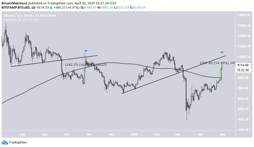 29 апреля биткоин сформировал на свечном графике массивную модель бычьего поглощения, укрепившись внутри дня более чем на $1000. Цена достигла максимума на $9455, после чего на следующий день откатилась обратно под отметку $9000.