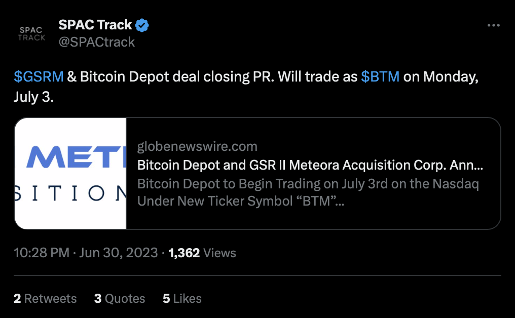 Сделка по приобретению компании специального назначения (SPAC), о которой впервые сообщалось в августе 2022 года, обошлась в $885 млн. Ожидается, что она позволит инвесторам получить доступ к обыкновенным акциям Bitcoin Depot на бирже Nasdaq уже 3 июля.