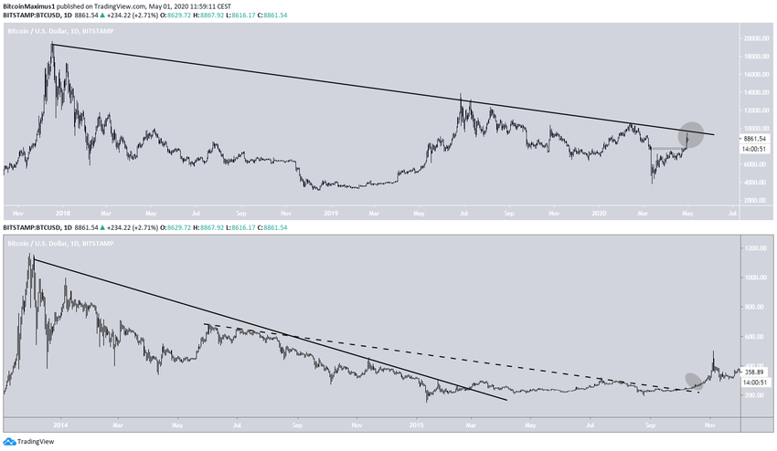Примечательно, что в 2015 году цена не стала возвращаться к пробитому сопротивлению, чтобы протестировать его в качестве поддержки (хотя она и была близка к этому). Если на этот раз ситуация повторится, это будет означать, что BTC не станет возвращаться к уровню $7300 и проверять его на прочность. Вместо этого цена после небольшого отката продолжит рост к новым максимумам.