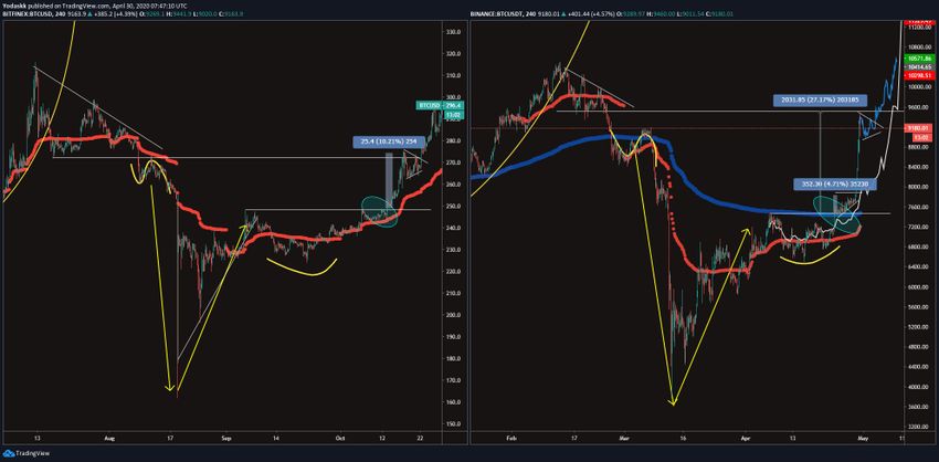 В 2020 году цена также с 1 марта двигалась вдоль линии восходящей поддержки. Коснувшись ее в четвертый раз (чуть ниже 50-часовой МА), пара начала расти. Если рынок в точности повторит прошлый паттерн, то BTC может просесть в район $8100, а затем возобновить рост и к 7 мая достичь максимума в районе $10 000.