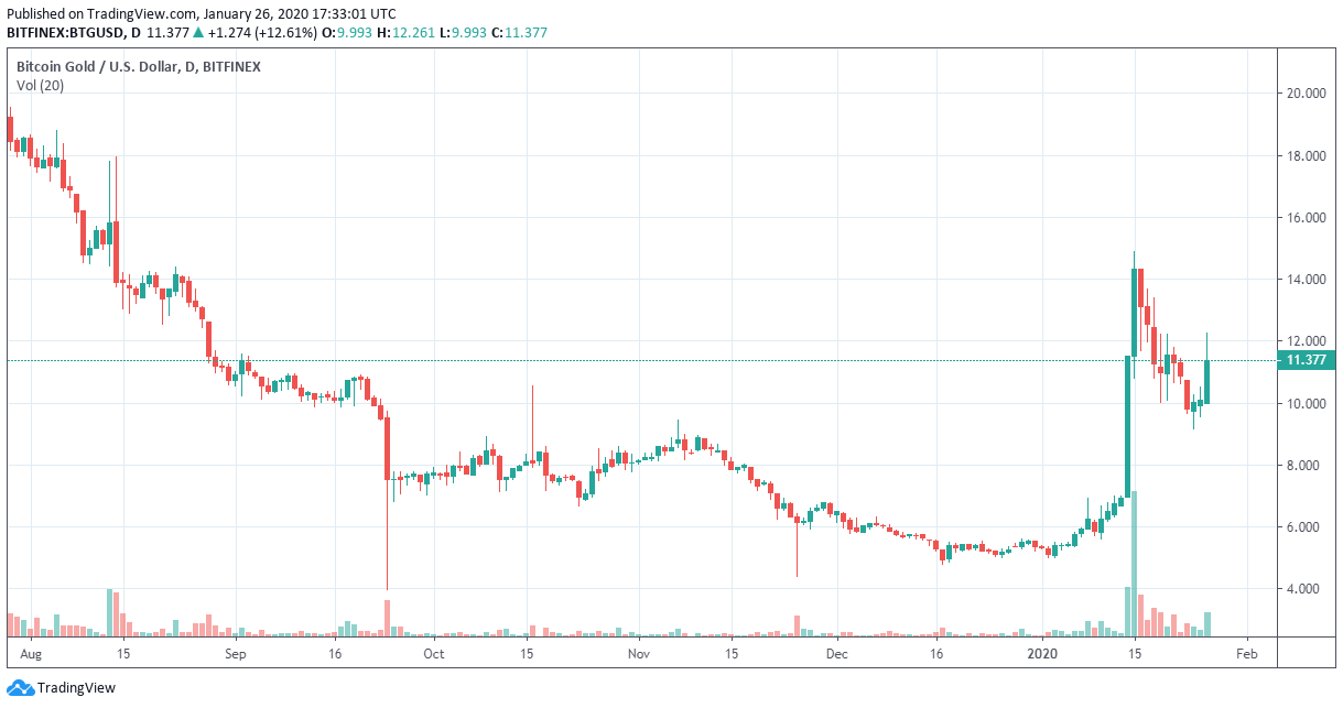 Bitcoin Gold (BTG), 35-я по величине криптовалюта с текущей рыночной капитализацией 198 млн долларов, неожиданно резко укрепилась в воскресенье, несмотря на появление новостей о взломе сети. На текущий момент валюта торгуется на уровне $11,40, с повышением на 13,5% в дневном соотношении. В течение дня монета зафиксировала максимум на уровне $12,26. Относительно минимума, достигнутого в пятницу 24 января на уровне $9,16, BTG/USD вырос на более чем на 32% (на максимуме). Очевидно, что атака 51% не слишком расстроила трейдеров и не помешала криптовалюте отыграть потери, понесенные в начале недели, и выйти в зеленую зону по итогам последних семи дней.