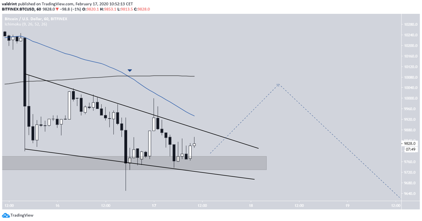 На часовых графиках видно, что биткоин торгуется внутри фигуры нисходящий клин. В скором времени может произойти прорыв в форме ралли облегчения в направлении отметки $10000, но затем криптовалюта, скорее всего, снизится и достигнет ранее упомянутой поддержки в области $9000-$9200.