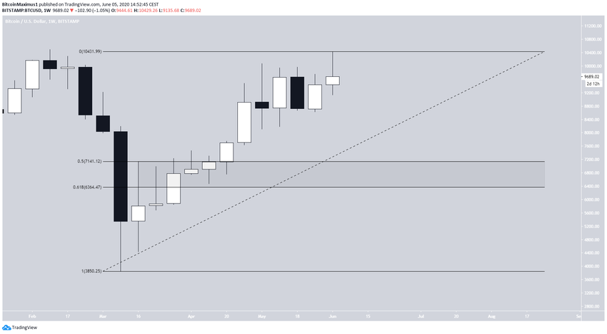 Если мы действительно увидим реализацию такой динамики, BTC, вероятно, запустит долгосрочный нисходящий тренд. В этом случае наиболее вероятным уровнем разворота станет область между $6300 и $7100, где проходят уровни Фибо 0.5-0.618 коррекции всего бычьего хода цены от 13 марта.